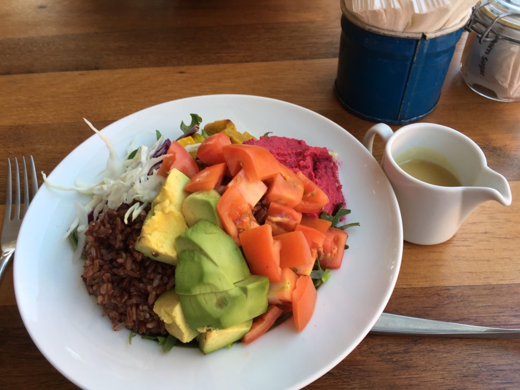 On a Sunday in January, Mark and I decided to rent bicycles and ride the 5 km to the temple complex of Angkor Wat. We left Siem Reap at 8am, later than planned. I needed to stop every couple of blocks for Mark to catch up. When we reached the ticket control officials near the temple entrance, we were told that we should have bought tickets (at a hefty $62 for 3 days of temple visits) 2 km earlier at the one and only Ticket Center. We headed back, got our tickets after I went 1 km beyond the ticket center in the wrong direction. It was almost noon and we were both exhausted with sore tusches. At that moment we decided to visit Angkor Wat with a tuk tuk driver the next day. Feeling good about our decision, we happily rode our bikes back to the rental agency near our guesthouse.ย Mark went back to our pleasant budget hotel, Tropical Breeze Guesthouse, to nap and I went to my go-to restaurant, Fifty Five. Here is a photo of the fabulous rainbow salad I had for lunch. It had pumpkin, avocado, tomatoes, beet hummus, wheat berries, cabbage and mixed greens, among other things.